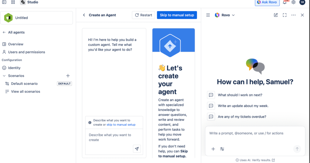 - Within Studio you can create and configure Rovo Agents (by wizard or manual setup).